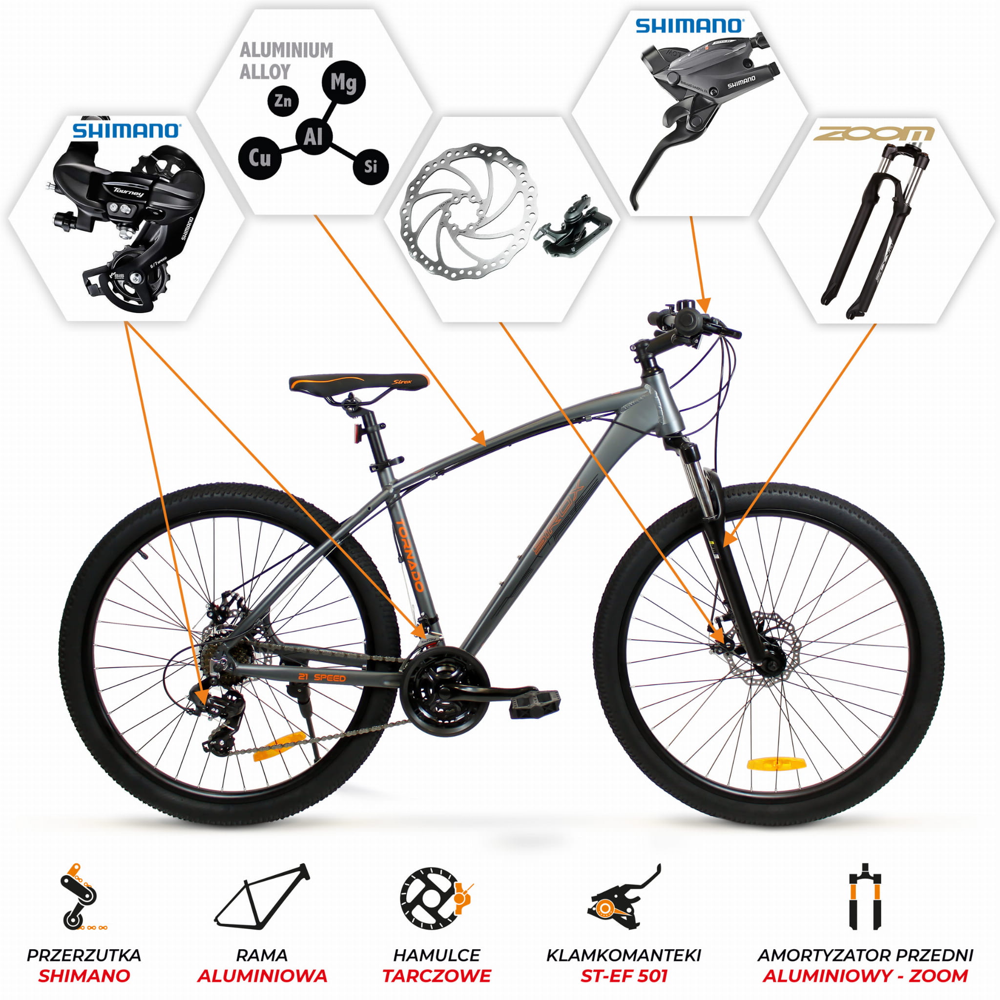 - Amortyzowany przedni widelec : ALUMINIOWY ZOOM skok 100 mm