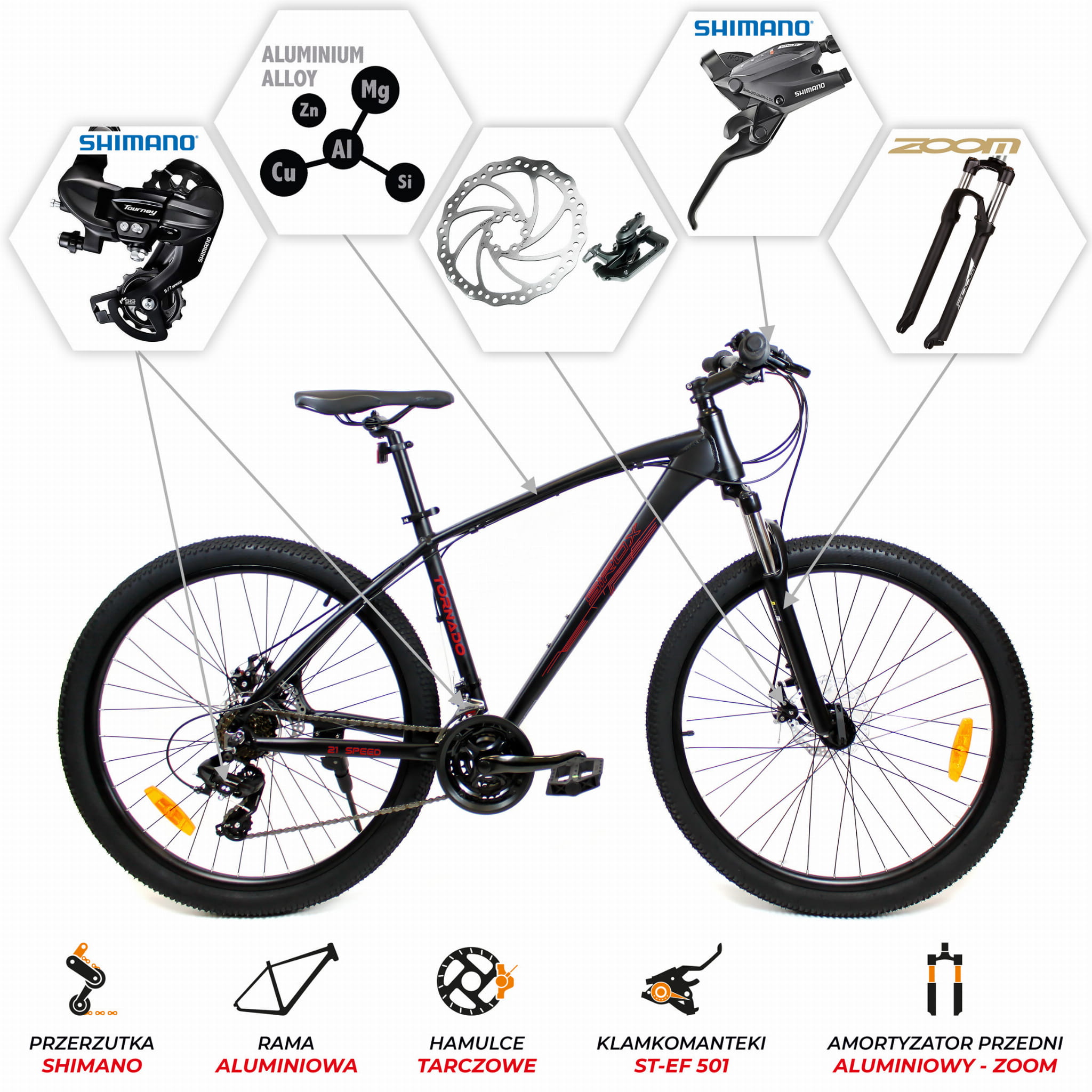 • Amortyzowany przedni widelec : ALUMINIOWY ZOOM  skok 100 mm