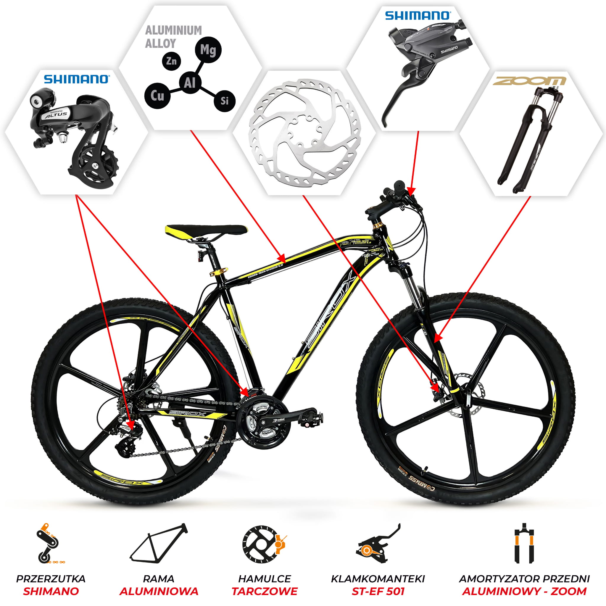 - Amortyzowany przedni widelec : ALUMINIOWY ZOOM skok 100 mm - BLOKADA + REGULACJA