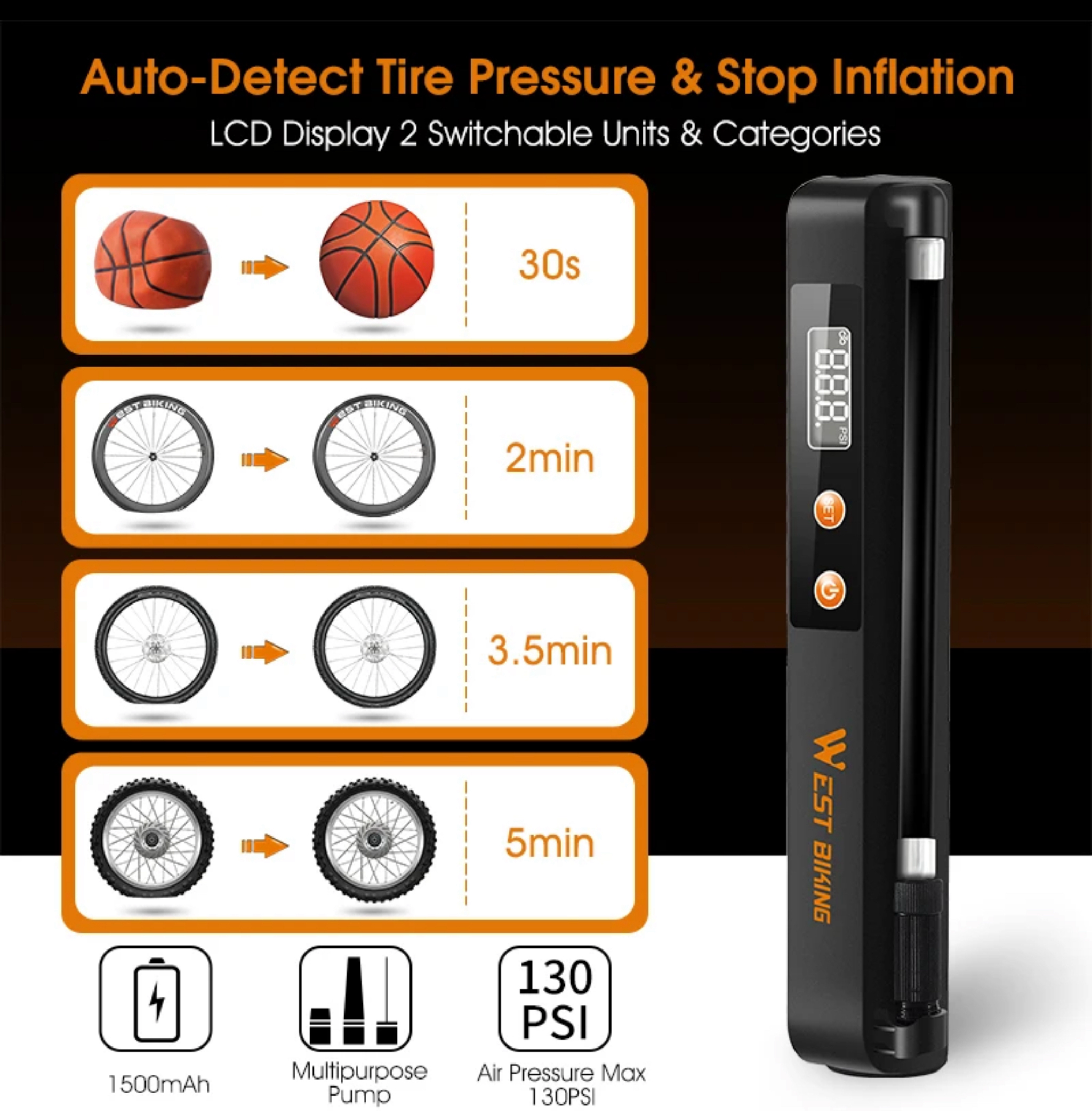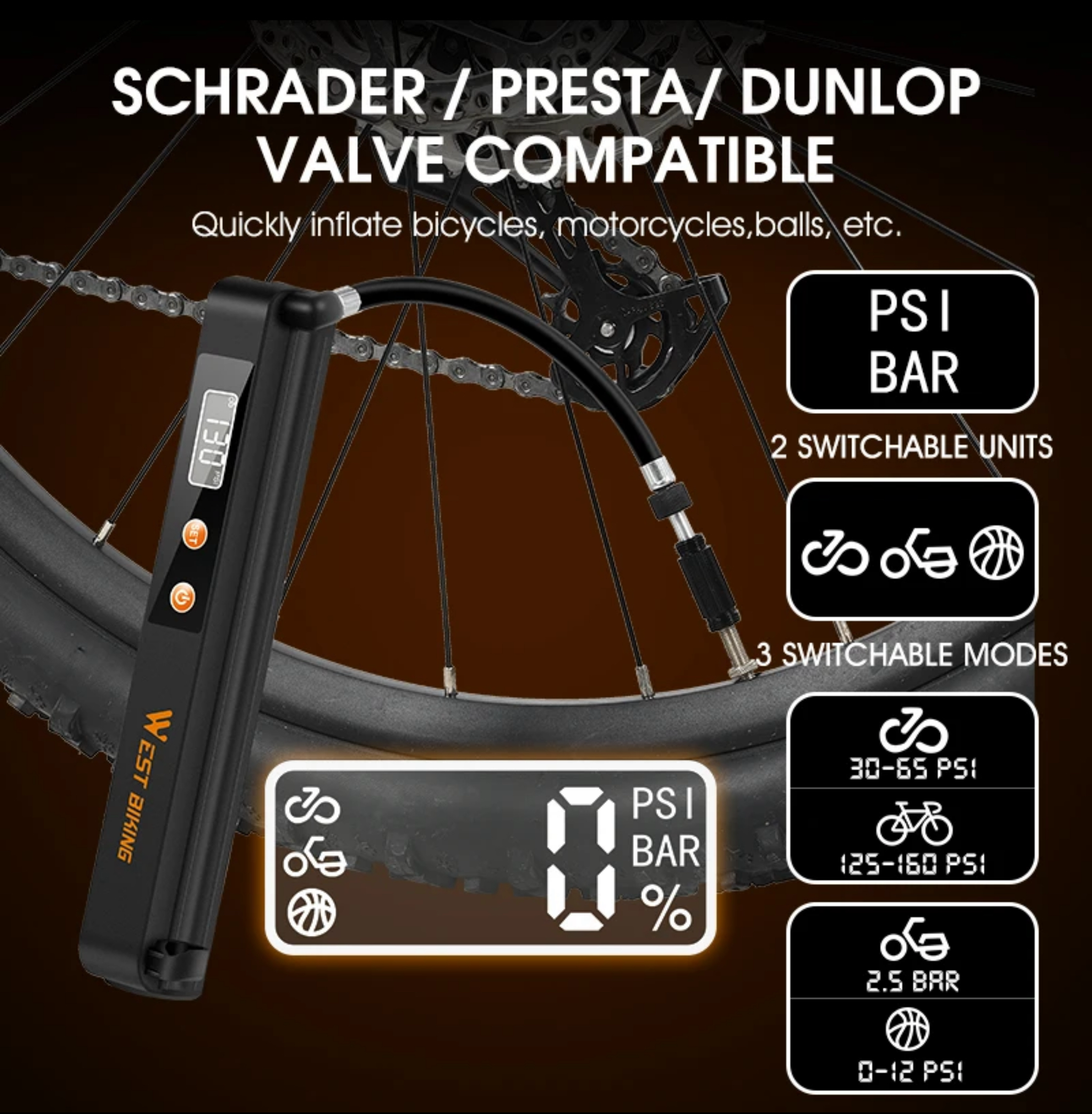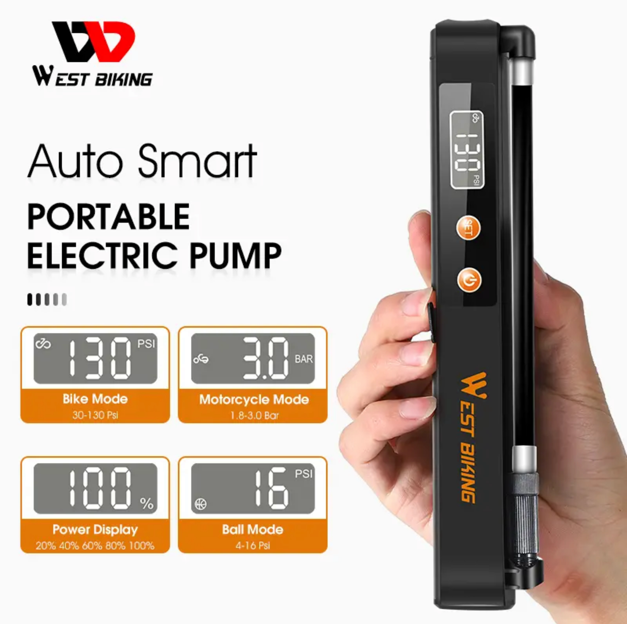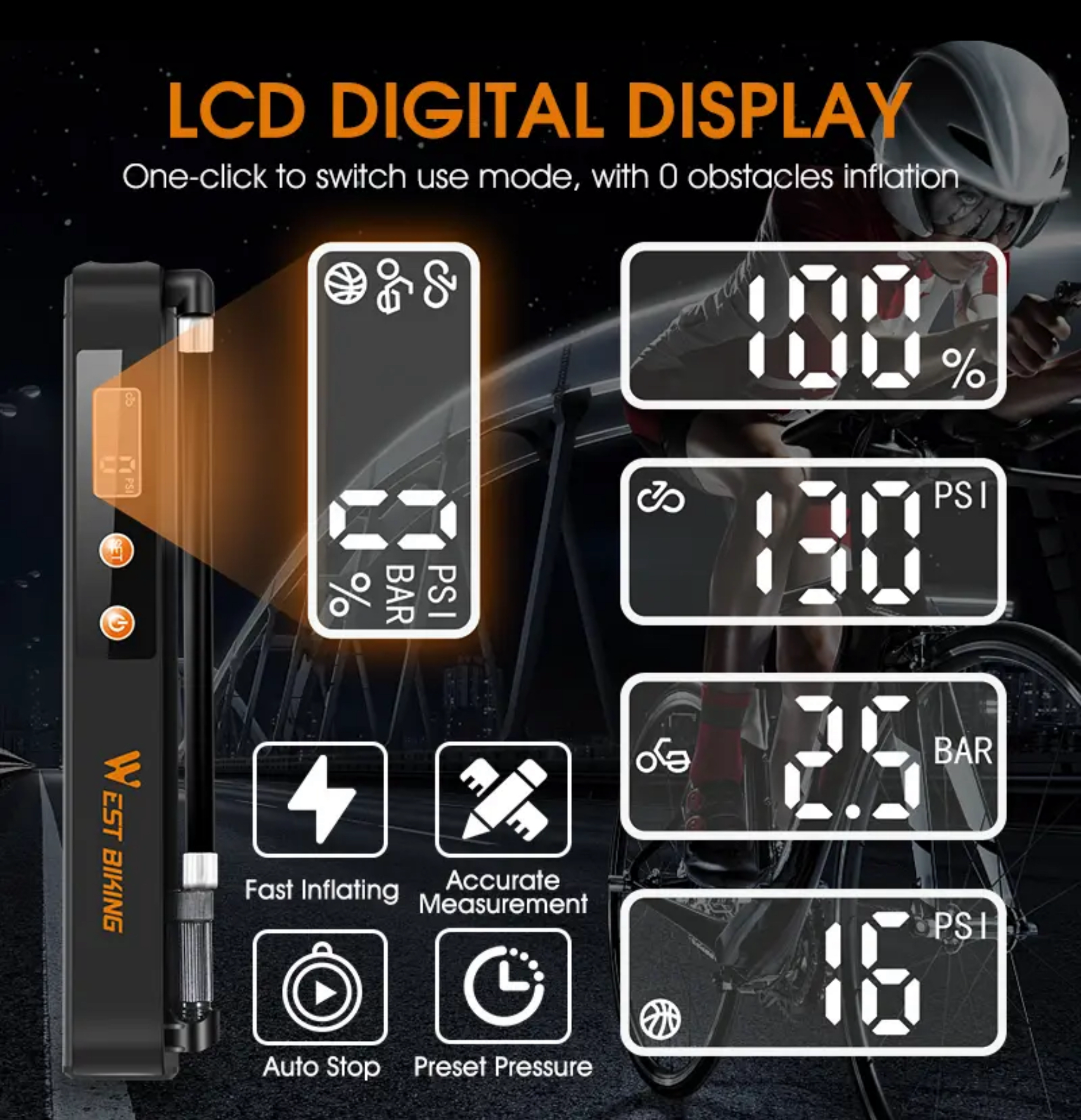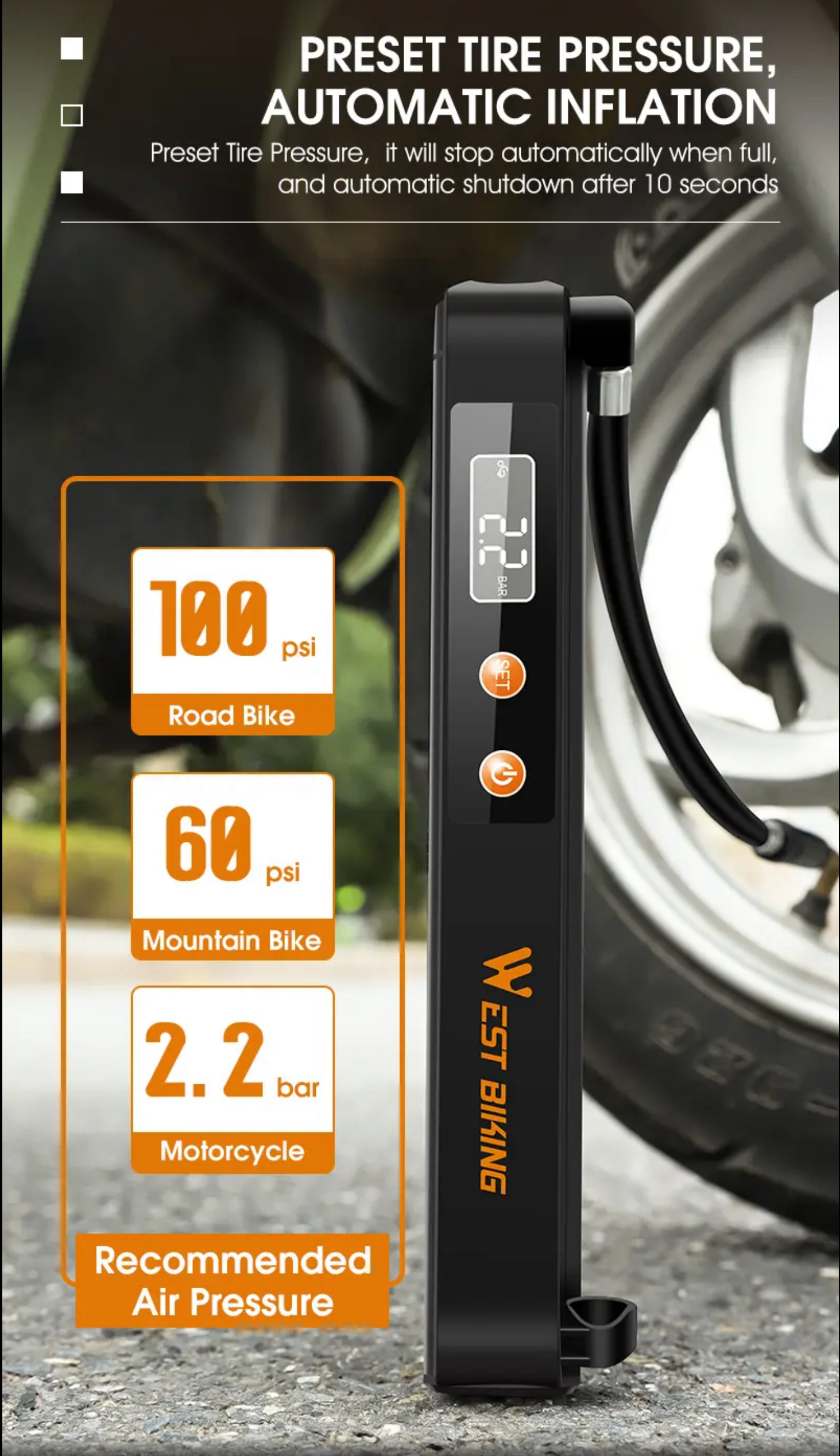 Inteligentna automatyczna pompka łatwo i przyjemnie pomoże Ci w napompowaniu roweru, motocykla, piłki . Sama się wyłączy gdy osiągnie żądane ( ustawione ) ciśnienie w pompowanym przedmiocie, unikniesz w ten sposób nadmiernego pompowania . Pompka posiada uchwyt dzięki któremu bardzo łatwo zamocować przy rowerze ( w miejsce uchwytu na bidon) dzięki czemu możesz mieć ja zawsze przy sobie podczas wypraw rowerowych .